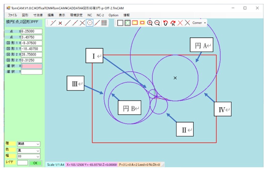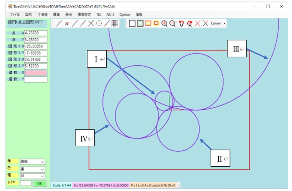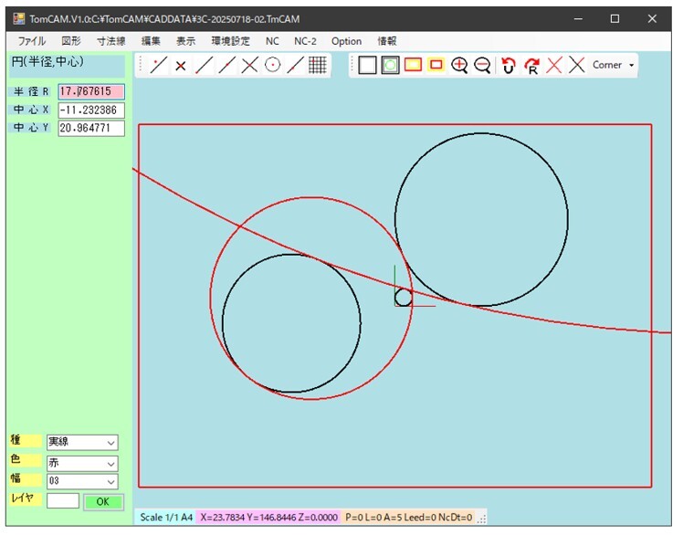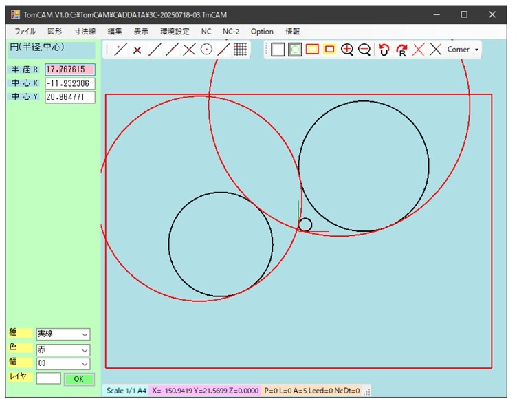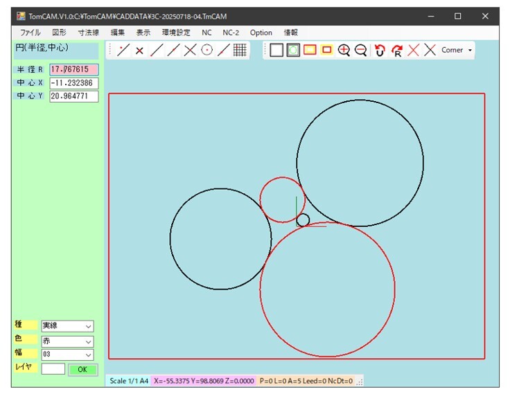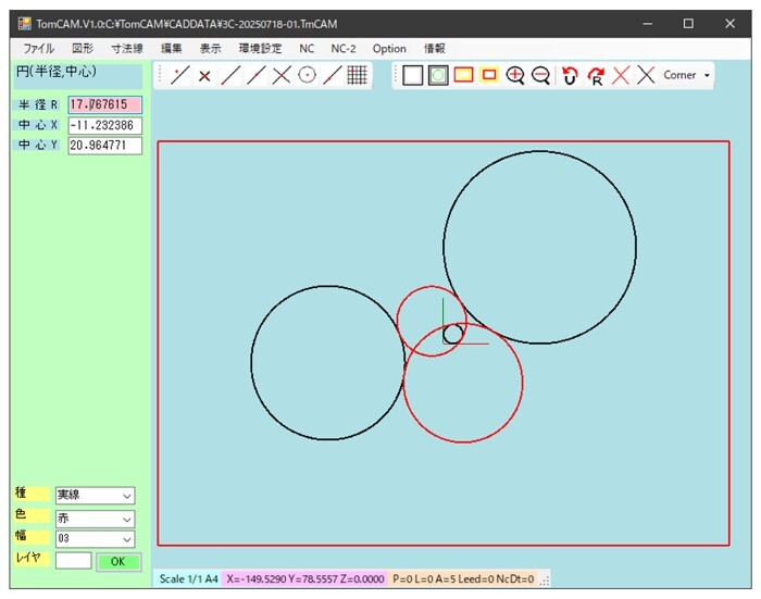 以上の手法をプログラムして以下のように求められるようになった。図17に接円の図を示す。