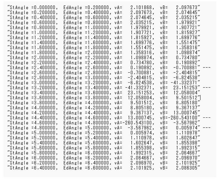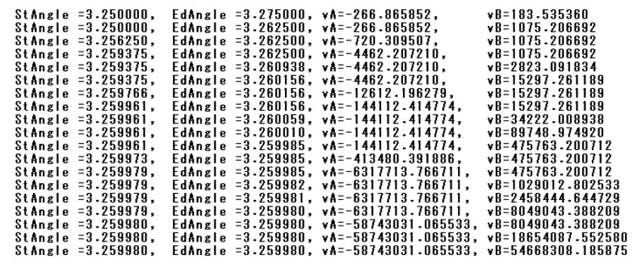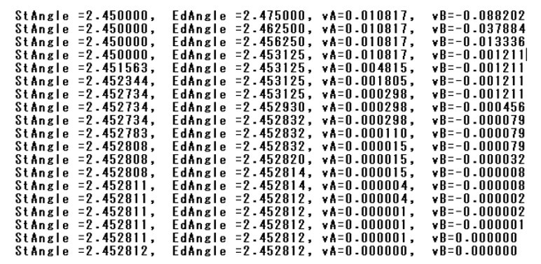 この操作を繰り返し、vA=vBとなるθを求めることとなる。その計算処理過程を図8-1には示す。この処理では収束したことがわかる。しかし、StAngle=3.25, EdAngle=3.30の区間においてはvAとvBの値は一致することなく、大きく離れてしまい発散してしまった。この場合は解が求められなかったこととなる。