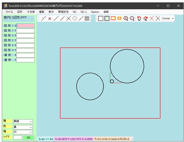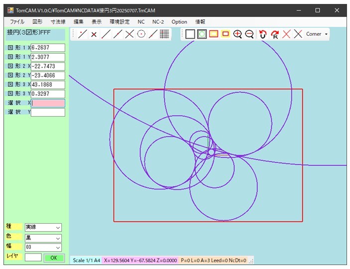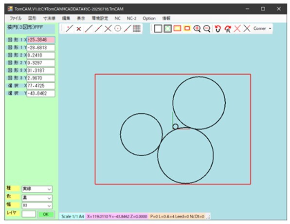 またCAD機能においては、ある図形に接する円を求める機能 が要求される。形状は滑らかに変化する曲線が好まれる。二つ以上の図形に接する曲線を求める機能(例えば、1点を通り2直線に接する円をもとめる等)についてはとても苦慮したことがある。その一つが3円に接する円を求めることであった。3円に接する一つの円を 中心座標(x,y)と半径rで表現しようとすると、計算途中で二つの式と変数が3個の状態となり求められなくなった。そこで、求めようとする円の中心座標を半径と角度により表現し、角度をあるピッチで探索するようにした。その後、解がありそうな範囲を絞り込み、解を求める手法をとり、解決できた。