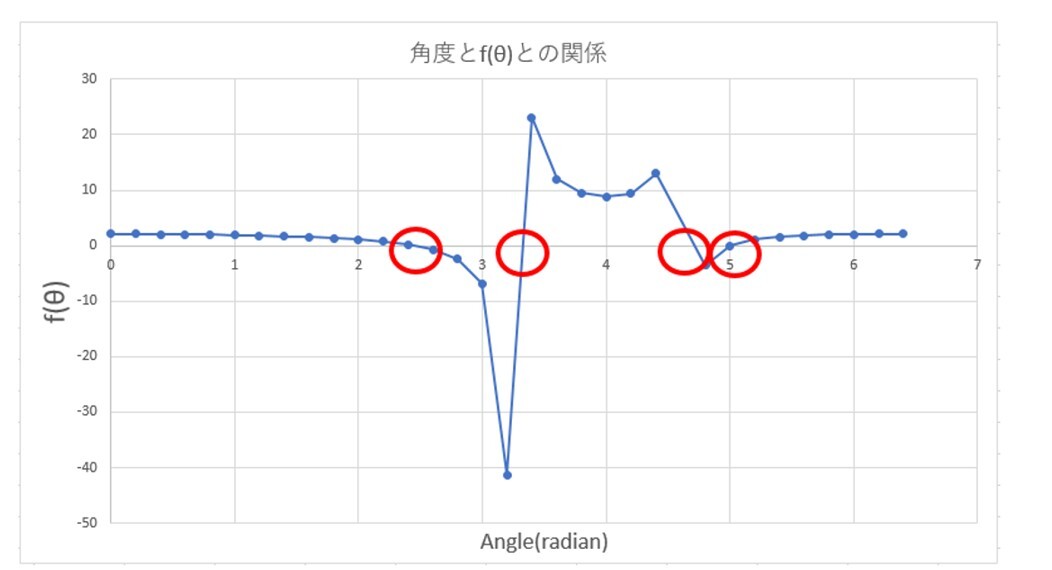 この図6のグラフでは、角度4.6(radian)のf(θ)= -260.5431のデータはグラフがわかりにくくなるため削除している。この図からわかるように赤丸で示した4か所の位置は、f(θ)の値が正から負になる区間、または負から正になる区間であり求める解がある。これらの区間で挟み込み方式で正解値を求めることとした。