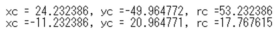 ここで、3個の円を円Oの中心座標(5,5)半径5、円Aの中心座標(50,50)半径50、円Bの中心座標(-60,-10)半径40とする。そして、円Oの半径を「0」にして、円Aの半径を円Oの半径分だけ加算・減算、円Bの半径を円Oの半径分だけ加算・減算、として解いてみることとした。