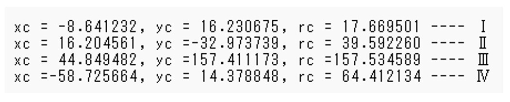 それぞれの領域において解となる数値を求めると4つの解を得ることができた(図9参照)。また、求められた解によって作成された円を図10に示す。