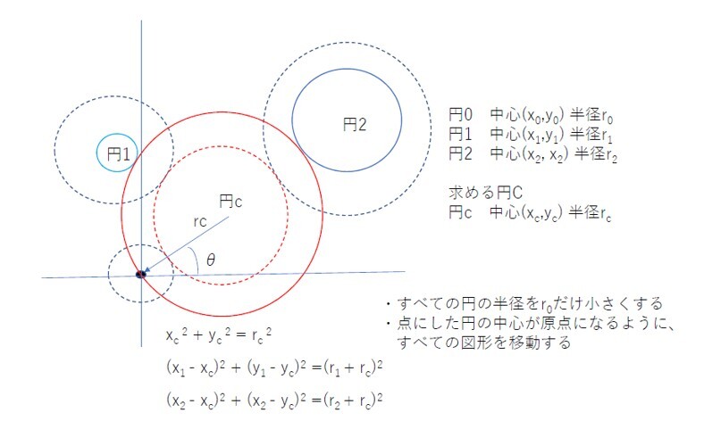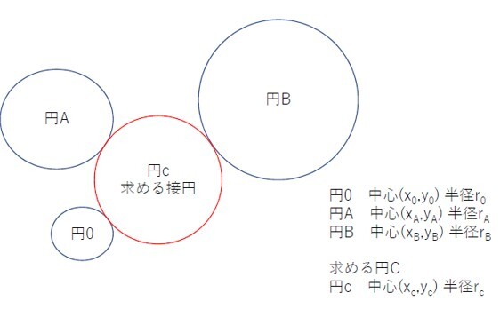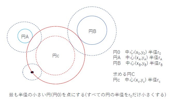 ここで半径の数値に±があるのは内接または外接に対応する。そして、変数は円Cの中心座標と半径の3個で式も3式あるので解が求められそうであるが困難である。しかし、一つの円を点としてとらえ、その半径分の数値を他の円の半径に加算または減算することで計算を簡略化できそうだと考えた。