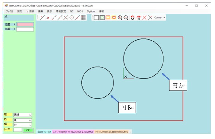 ・点Oを通り、円A 半径を円の半径分だけ加算、円B 半径を円の半径分だけ加算とに接する円を求める。具体例として、以下の手順で求める。