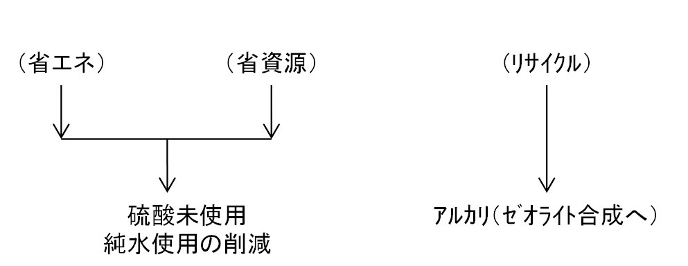 リサイクルで生じたアルカリは、シリカとアルミナを主成分とする無機多孔性体であるゼオライトの湿式合成の原料として使用する例などで付加価値を高めることが考えられる。
