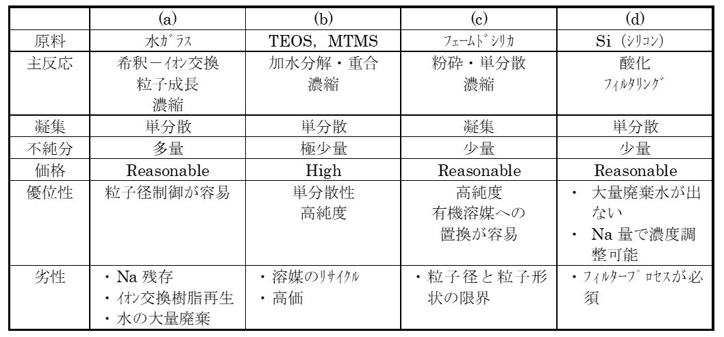 表1 シリカゾルの製造プロセス比較