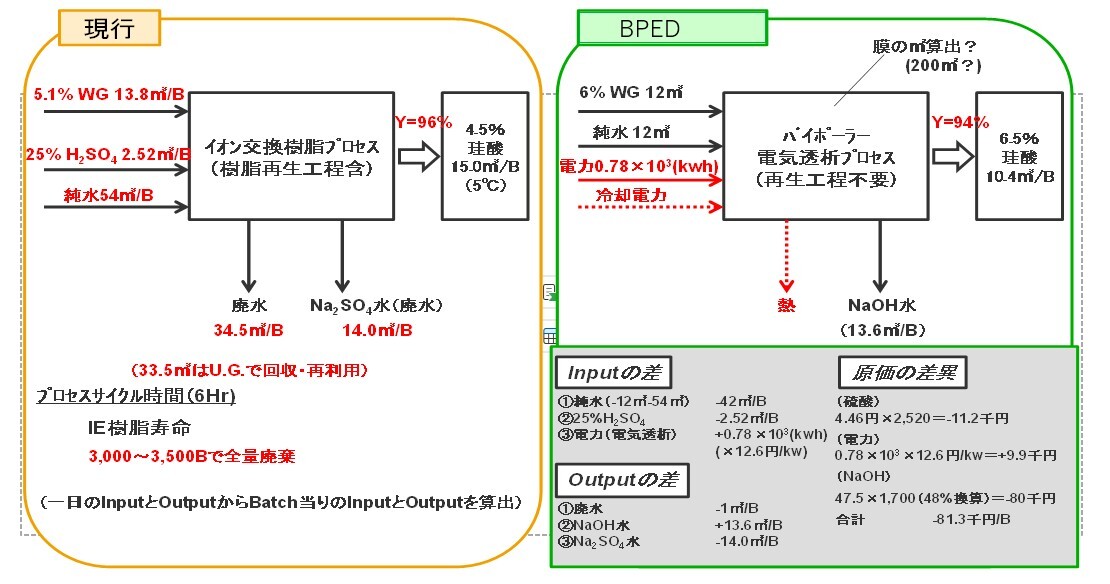 製造原価への影響として、電気透析に必要な電気代は硫酸の原料代より小さいことが推測される。電気透析の設備の償却費の算出が必要であるが、NaOH水(5~6%)の副生成物の有効利用で埋め合わせができるものと考えられる。インプット分として、純水の低減とアウトプトットとして廃水とNa2SO4水の低減効果がある。また、生産性アップとして、現行の4.5%珪酸液濃度から6.5%珪酸液濃度アップが可能性となった場合、40%の生産性アップ(調合-濃縮時)が考えられる。しかし、BPED時の液温アップ(~20℃)の課題を生じることが考えられる。このため、冷却対策を徹底する製造管理の必要性が推測される。