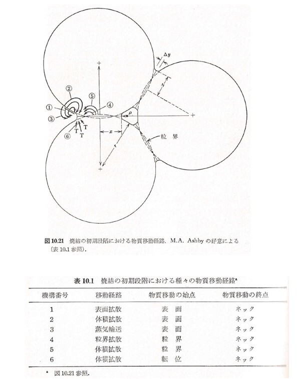 原子の移動するルートは表1に6通り上がっていますが、焼結の初期段階では、①表面拡散(粒子表面で拡散)、③蒸気輸送(凸部から蒸発、凹部に凝縮)、④粒界(粒子の接触面)拡散が主な経路と言われています。