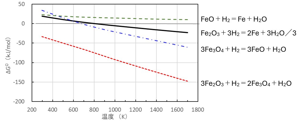 図6 酸化鉄の水素還元反応の標準自由エネルギ変化