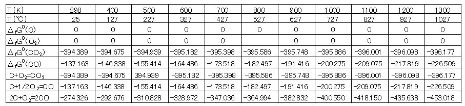 表1 C, O2, CO2, CO の標準生成自由エネルギー変化ΔfGo [JANAF]