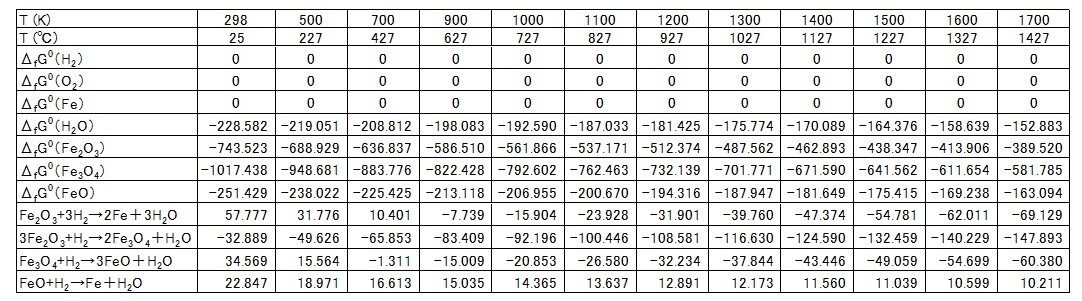 表3 酸化鉄のH2還元に関する各反応成分の 標準生成自由エネルギー変化ΔfGo [JANAF]