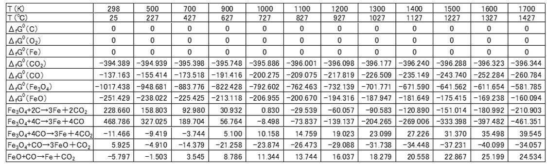 表2 酸化鉄のC還元に関する各反応成分の 標準生成自由エネルギー変化ΔfGo [JANAF]