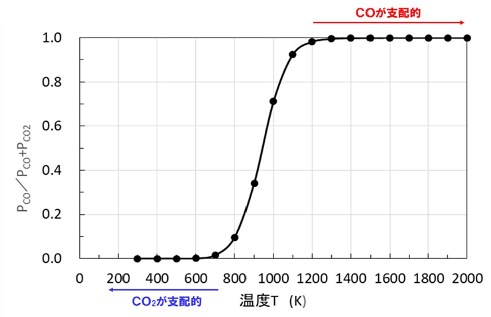 この反応はブードア反応(Boudouard reacton)と呼ばれ、製鉄業では高炉内のガス反応において重要な役割をはたす。また、炭素と酸素の反応が伴う化学工業や冶金プロセスでも重要な反応である。図3は[11]式の化学平衡における生成ガス中のCOガスの分圧(PCO/PCO+PCO2)を計算した結果である。炭素Cが共存する高炉内のような条件では、600K以下の低温域ではCO2ガスの生成が支配的で、1300K以上の高温域ではCOガスの生成が支配的であることがわかる.ここでは詳細な導出は省略する。