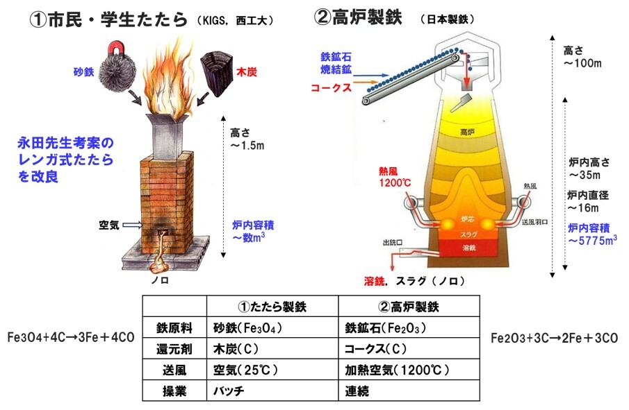 図4 レンガ式たたら製鉄と高炉製鉄の比較