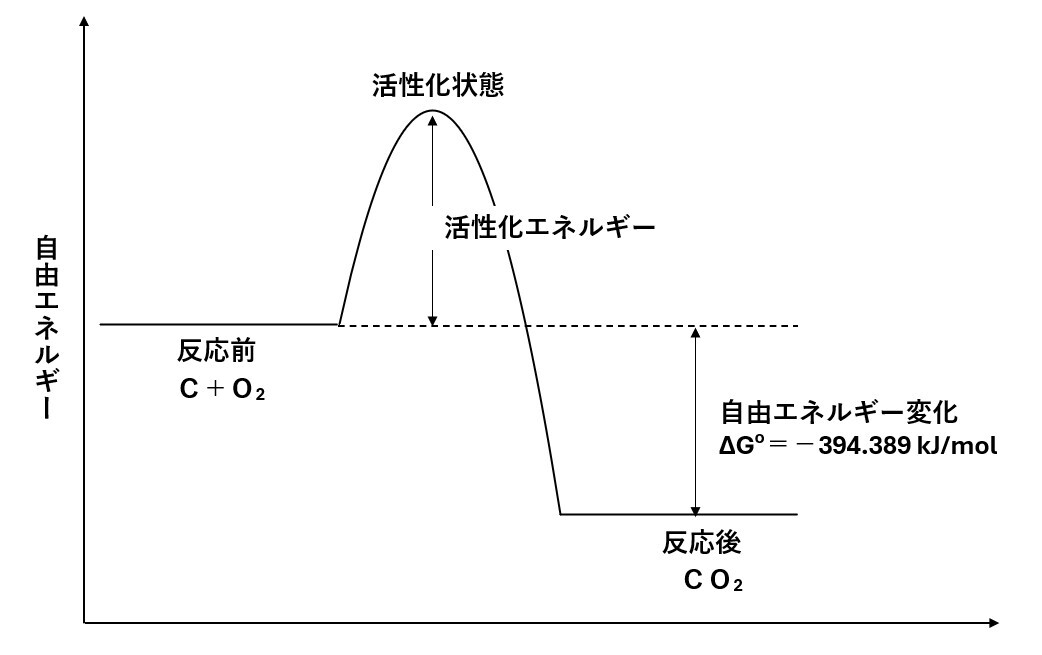 [6]式の化学反応の標準自由エネルギー変化ΔGoは、-394.389 kJ/mol でマイナスであるので炭素Cと酸素O2との燃焼反応は25℃で起こりうるということになる。 バーべキューの木炭が勝手に燃えてしまうということになるのだが、実際は化学反応が起こる状態まで活性化させるエネルギー(活性化エネルギー)が必要であり、そう簡単にはいかないことに注意が必要である。図1に自由エネルギー変化と活性化エネルギーの概念図を示す。化学熱力学で予測できるのは、あくまで反応が起こりうるということである.いわゆる、反応が起こるための必要条件ということである。